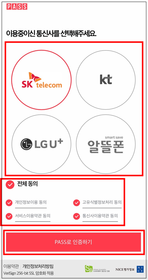 6. 이용 중이신 통신사를 선택하고 전체 동의를 클릭 후 PASS 인증 또는 문자(SMS)로 인증을 진행해 주세요.