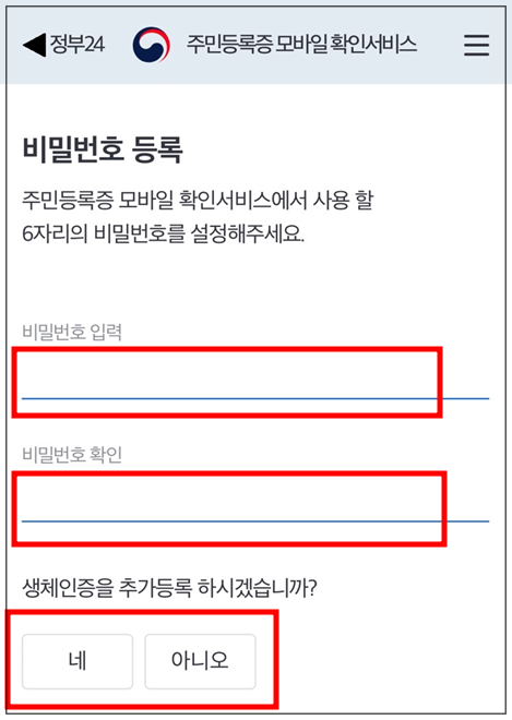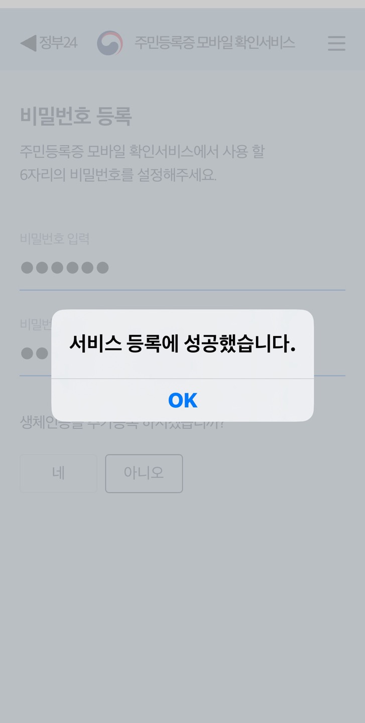 8. 주민등록증 모바일 확인서비스에서 사용할 6자리의 비밀번호를 설정해 줍니다. 생체인증 추가등록을 원하시는 경우 '네'를 눌러서 진행해 주면 '서비스 등록에 성공했습니다.'라고 나오고 'OK'를 눌러주면 끝입니다.