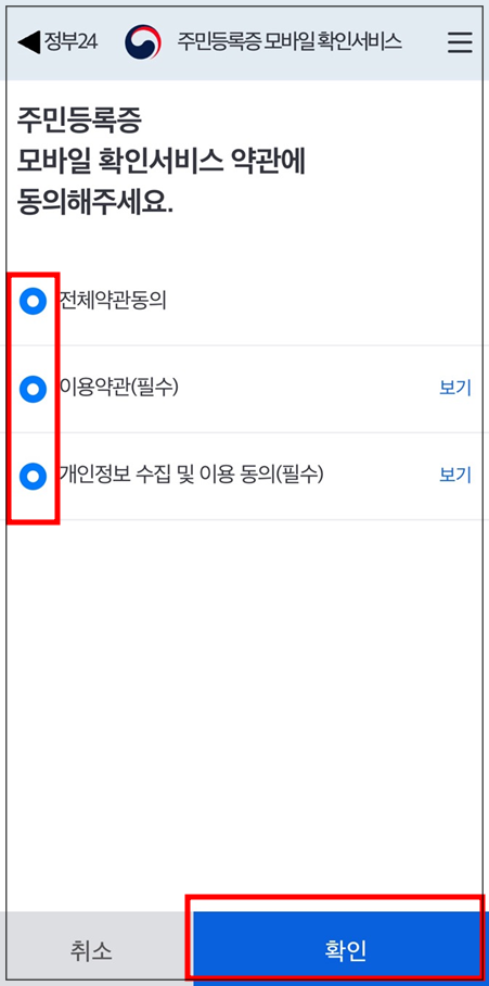 5. 주민등록증 모바일 확인서비스 약관 내용을 확인하고 왼쪽에 동의에 체크한 후 하단에 '확인'을 눌러주세요.