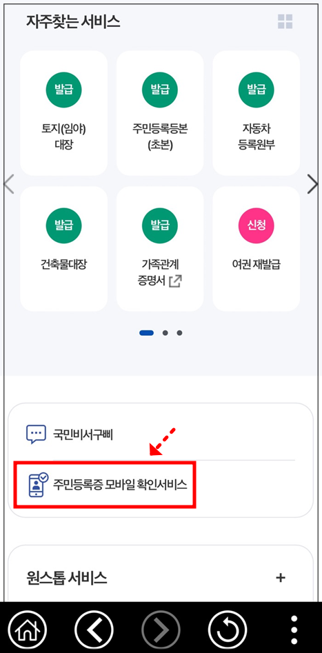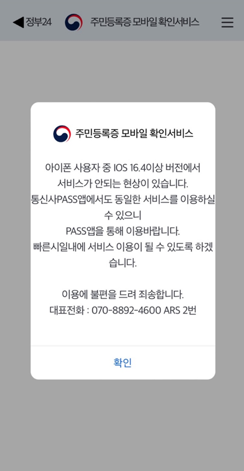 4. 로그인 후 화면에서 밑으로 조금 내려가보시면 '주민등록증 모바일 확인서비스'가 보입니다. 터치해 주세요. 추후 모바일 신분증을 사용하실 때도 여기까지 순서로 진행해 주시면 되니 참고해 주세요. 아래와 같이 팝업창이 뜨면 '확인'을 눌러줍니다. 아이폰 사용자 중 IOS 16.4 이상 버전에서 서비스가 안 되는 현상이 있는데 통신사 PASS앱을 이용하면 된다고 합니다. 주민등록증 확인서비스는 본인 명의 개인 휴대폰만 등록 가능하니 참고해 주세요.