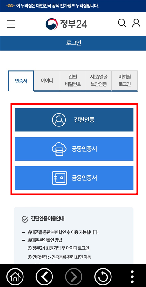3. 로그인은 간편인증, 공동인증서, 금융인증서를 통해 할 수 있습니다. 본인에게 편한 방법으로 진행해 줍니다. 저는 간편 인증에서 모바일 신분증(운전면허증)으로 인증 후 로그인 하였습니다.