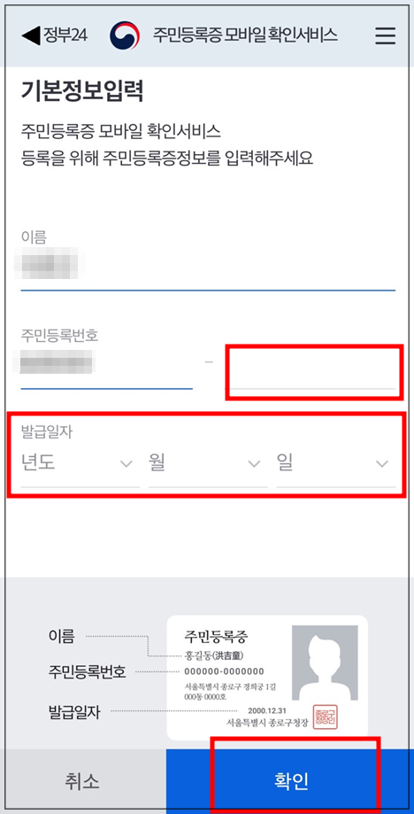 7. 기본정보를 입력합니다. 주민번호 뒷자리, 주민등록증 발급일자를 입력 후 하단에 '확인'을 눌러줍니다.