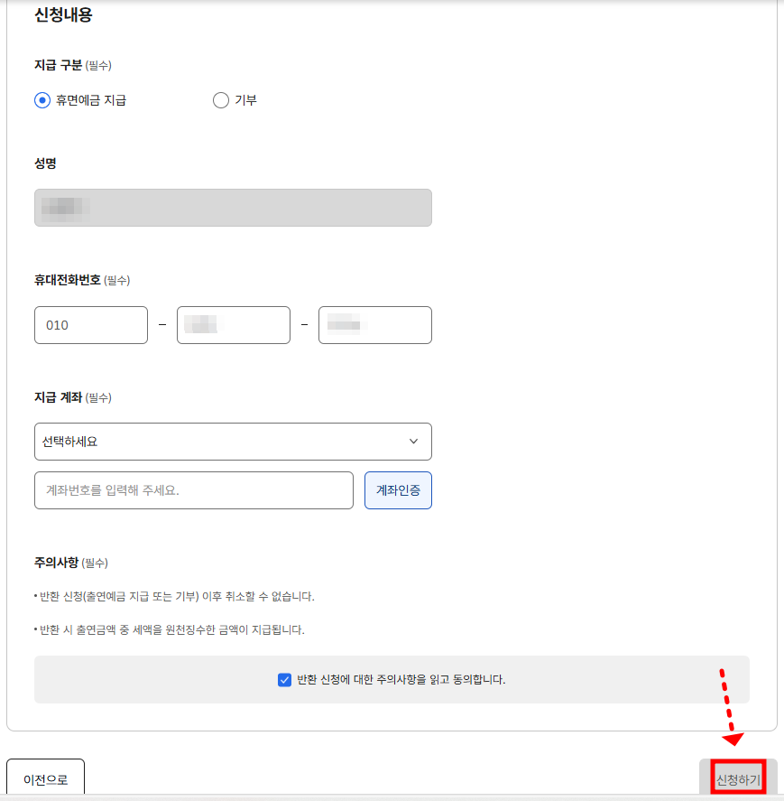 휴면계좌를 선택합니다. 휴면 계좌가 여러 개인 경우 각각 신청해주어야 합니다. '신청내용'에 '지급받을 계좌정보 입력 및 계좌인증' > '반환 신청에 대한 주의사항을 읽고 동의합니다'에 체크 > 우측 하단에 '신청하기' 순서로 진행해 주면 끝입니다. 휴면예금 출연금액은 '세전 금액'이며, 반환신청 시 실제 지급액은 '세후 금액'으로 다소 차이가 있을 수 있습니다.