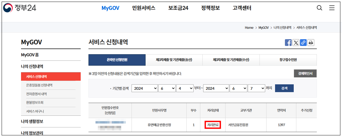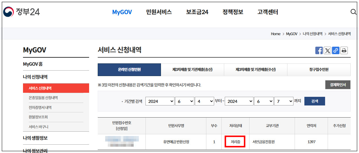 잠시기다리면 아래와 같이 '서비스 신청내역' 화면이 나오고 '처리 중'인 것을 볼 수 있습니다.