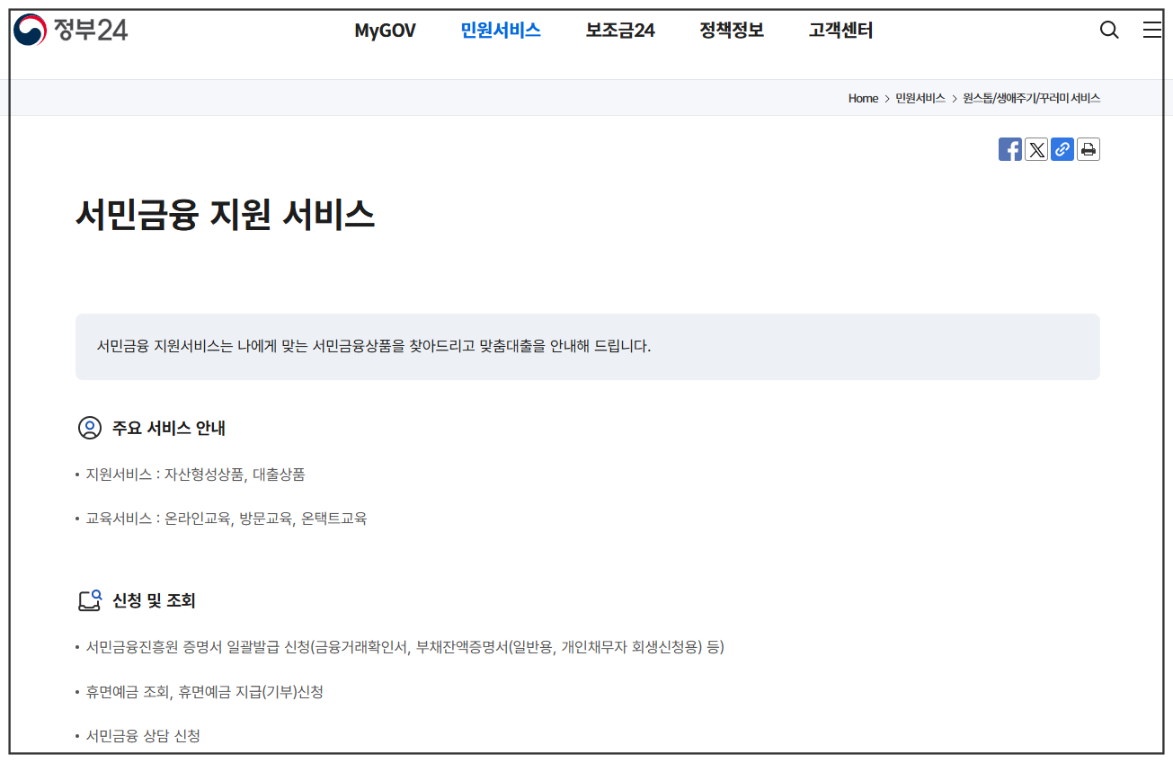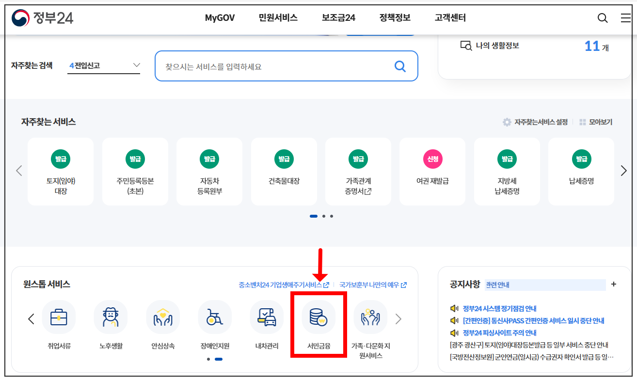 먼저 정부 24 웹사이트에 로그인한 후 '서민금융'을 클릭합니다. 해당 서비스는 서민금융진흥원에 출연된 휴면예금에 대하여 반환신청을 하는 서비스입니다.