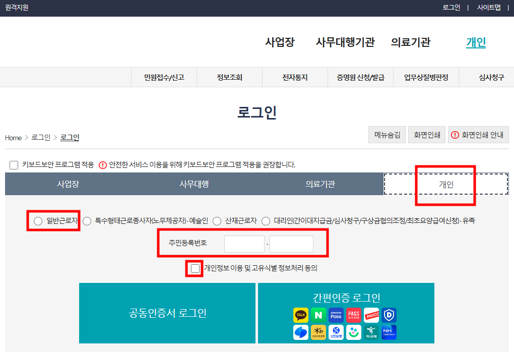 개인/일반근로자 선택합니다.