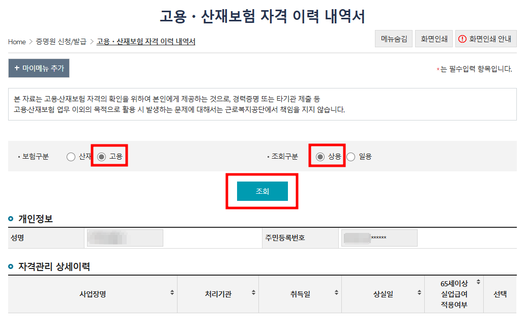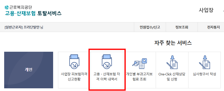 고용·산재보험토털서비스 자격이력내역 조회 경로