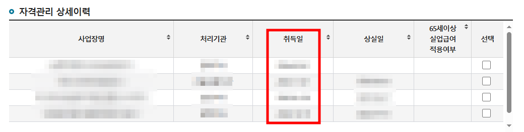 사업장의 고용보험 취득일 확인이 가능합니다.