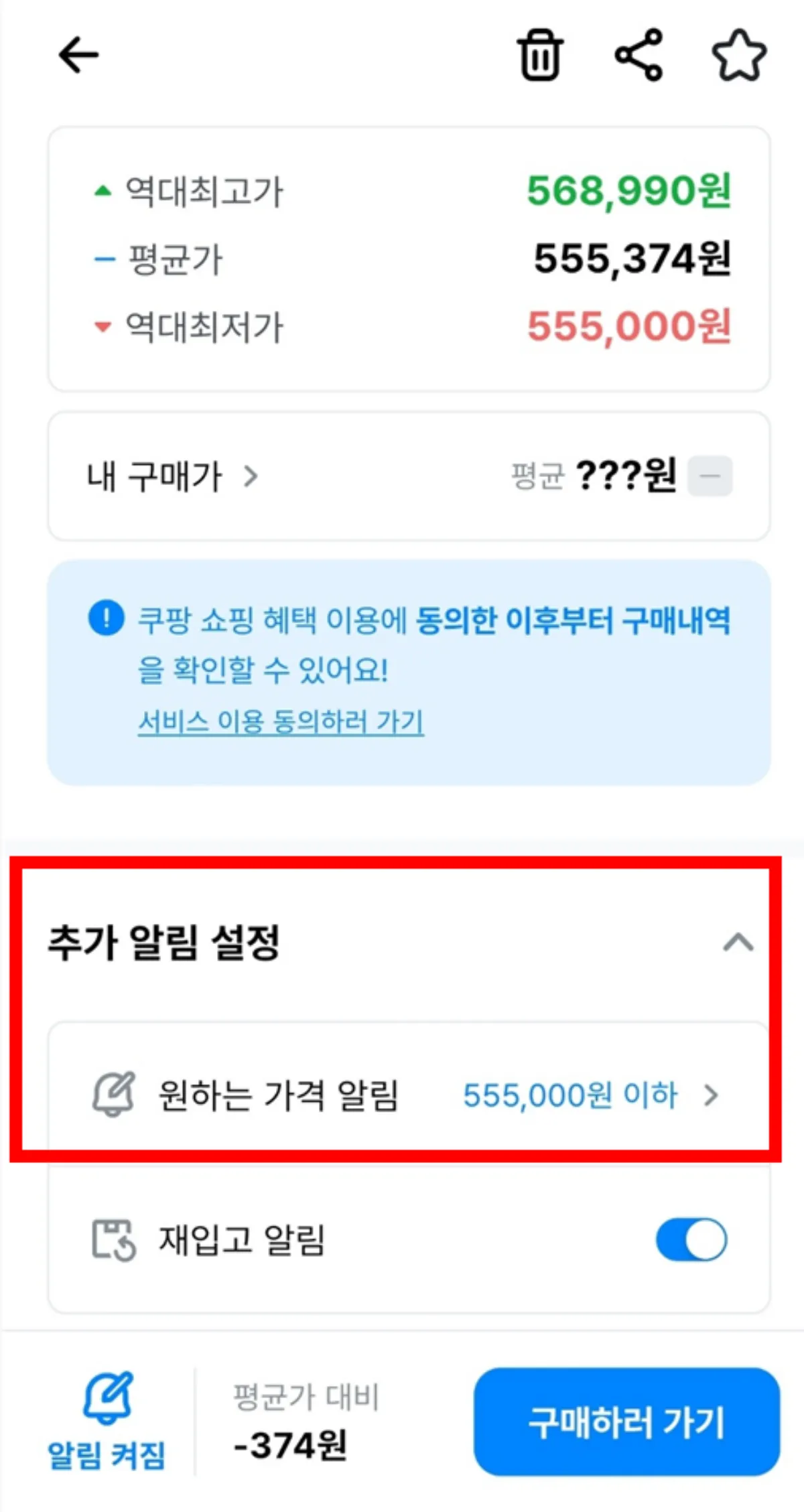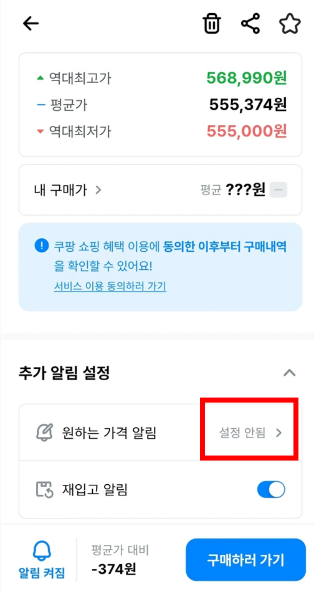 또한 원하는 가격에 알림 받기 버튼을 클릭하고 원하는 가격을 적어 설정 완료를 해두면 내가 원하는 가격대까지 떨어지게 됐을 때 알림을 받을 수 있습니다.