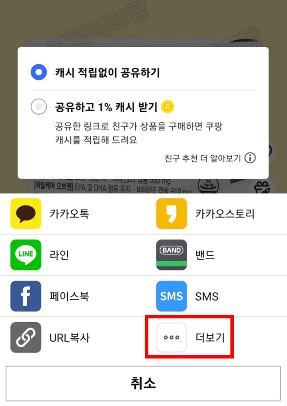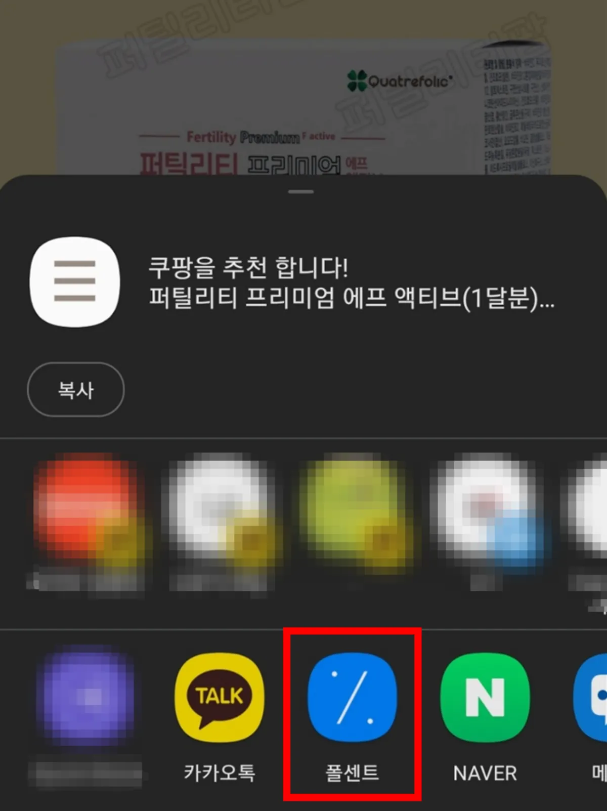 다시 쿠팡앱을 켜고 내가 사려던 상품 상세페이지에서 공유 버튼 누르기 > 더보기 누르기 > 폴센트 앱을 누르면 내가 사려는 상품이 어플에 추가가 됩니다.