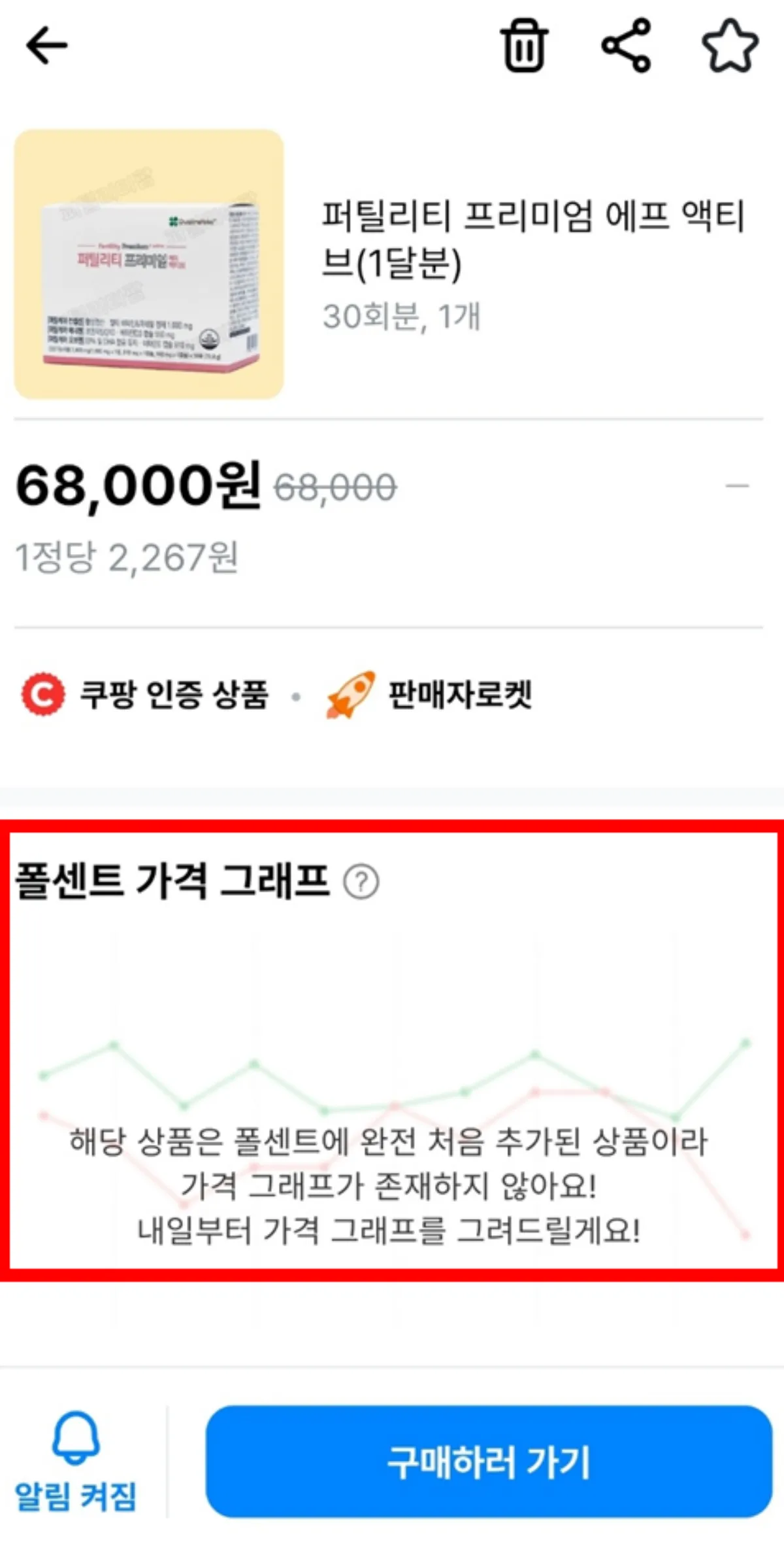 그런데 폴센트에 처음 추가 된 상품은 가격 그래프가 존재하지 않는다고 해요. 이런 경우 다음날부터 가격 그래프를 확인할 수 있겠네요.