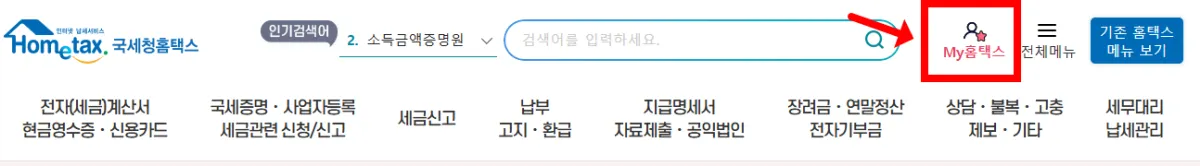 국세청홈택스 사이트에 로그인한 후 우측 상단에 My홈택스를 클릭합니다.