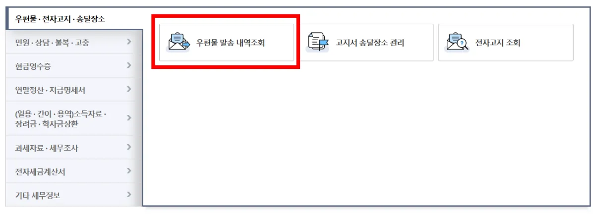 우편물 발송 내역조회를 클릭합니다.