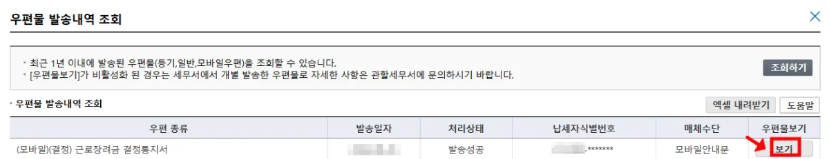 우편물 발송 내역 조회 화면에서 보기를 클릭합니다.