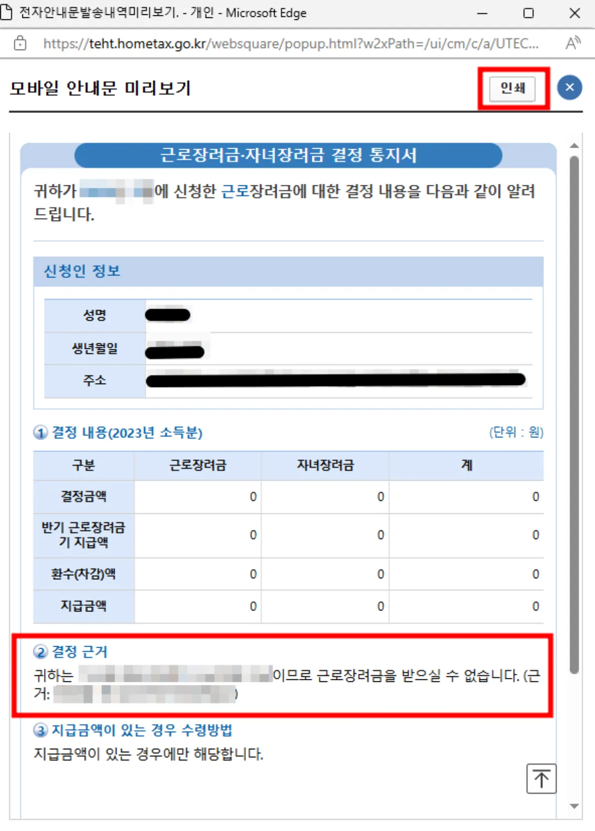 모바일 안내문 미리 보기에서 근로장려금 지급 대상이 아닌 결정 이유 및 근거 확인이 가능합니다.