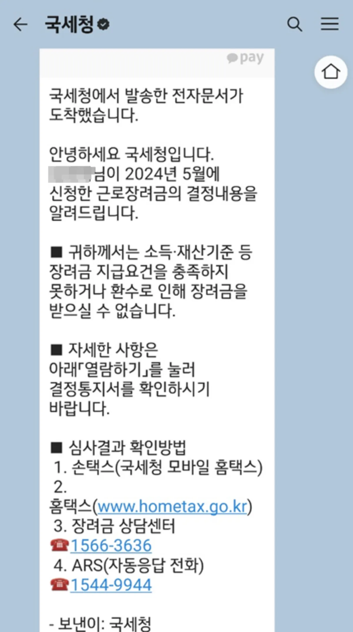 근로장려금을 신청을 하게 되면 지급 여부가 결정된 후 국세청으로부터 다음 아래와 같이 알림톡을 받게 됩니다.