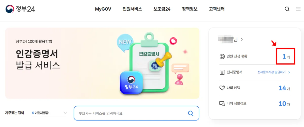 정부 24에 로그인해서 '민원신청현황'을 클릭해 보니 처리상태가 '처리완료'로 되어있었어요.