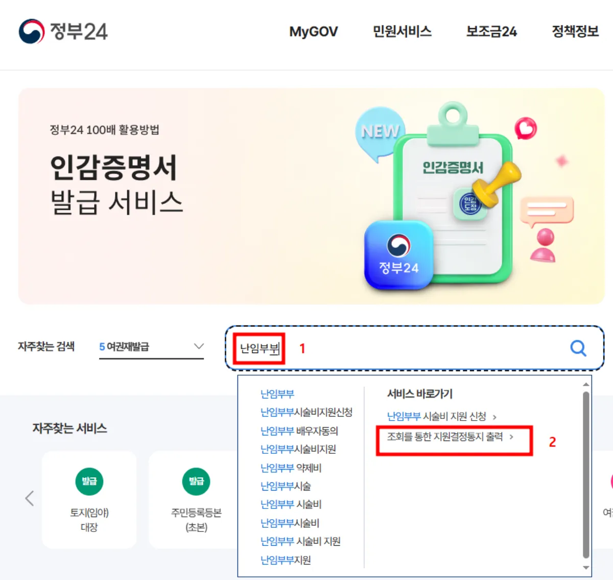 메인화면으로 돌아가 검색창에 '난임부부'라고 검색하면 나오는 '조회를 통한 지원결정통지 출력'을 클릭합니다.