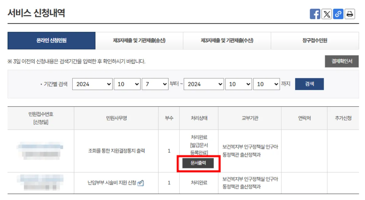 잠시 기다리면 서비스 신청 내역화면이 나오는데 '문서출력'을 눌러 통지서를 PDF로 저장 및 프린트 출력이 가능합니다.