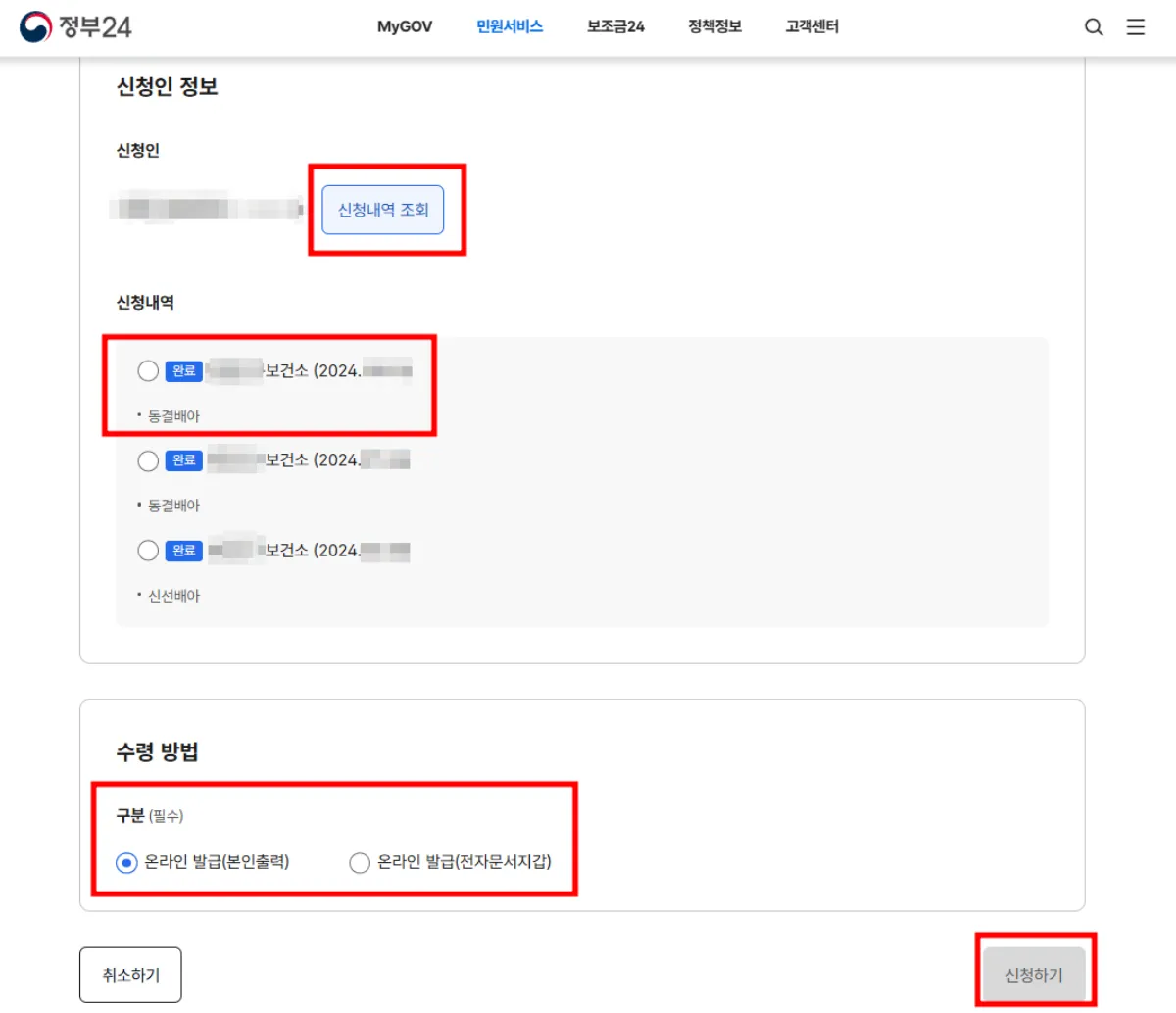 '신청내역 조회' 클릭해서 해당 시술에 체크 > 원하는 수령 방법 체크 > 우측 하단에 '신청하기'를 클릭합니다.