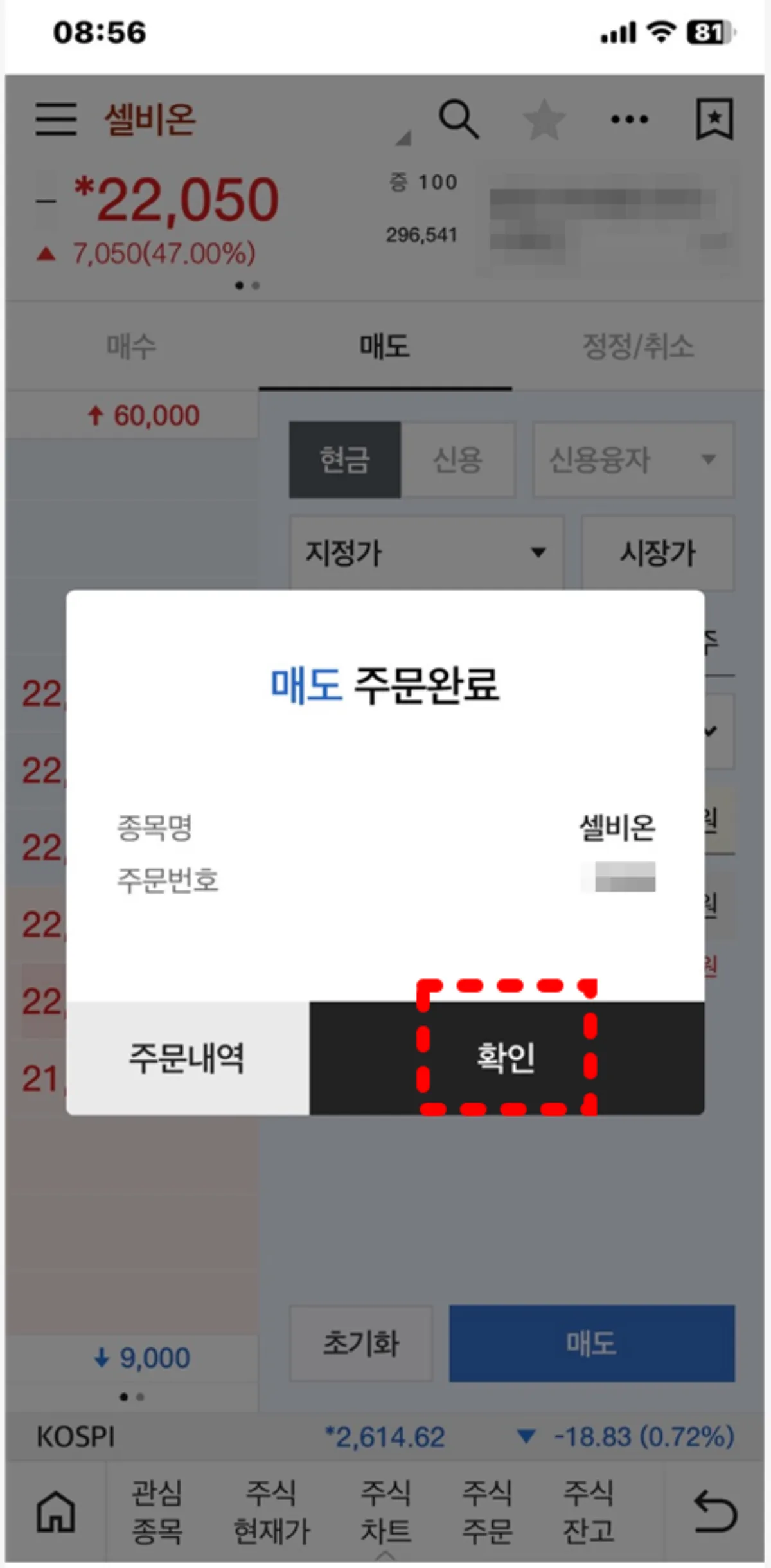 '매도 주문완료' 팝업창이 나오면 끝입니다.