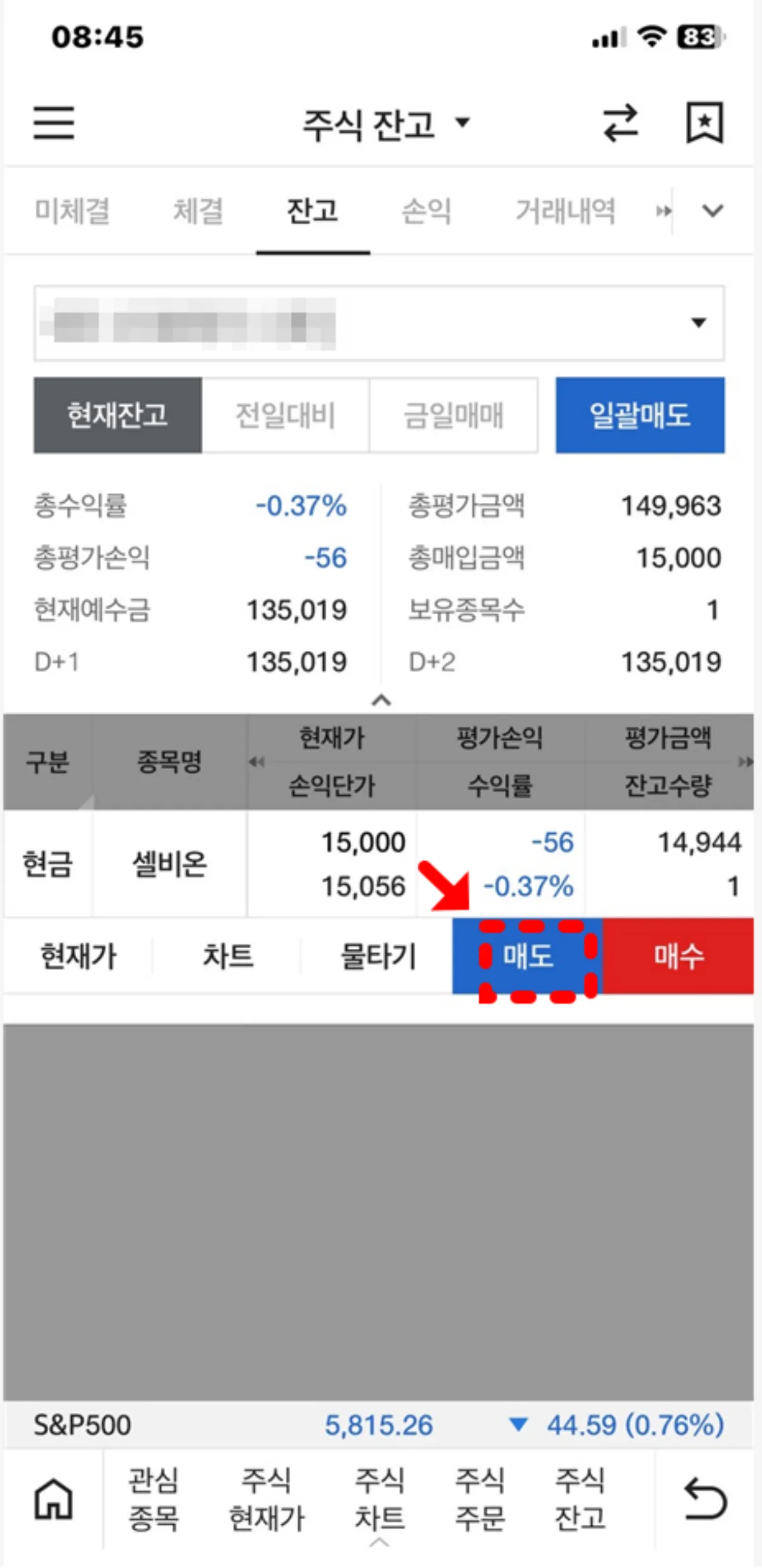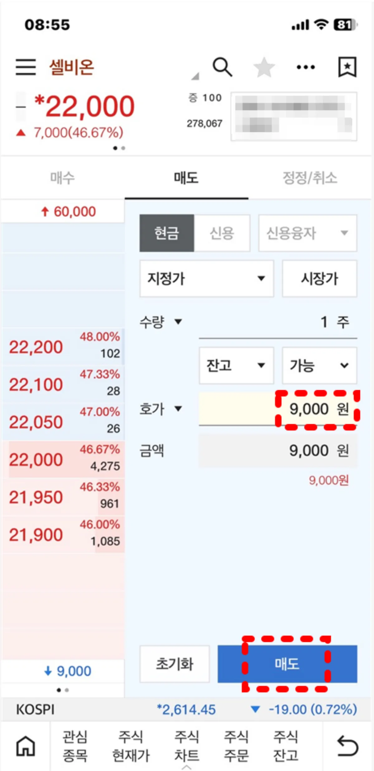 4. '호가'에 공모가의 60% 금액을 입력합니다( 셀비온 공모가 15000x0.6=9,000원) > 하단에 '매도' 버튼을 누릅니다.