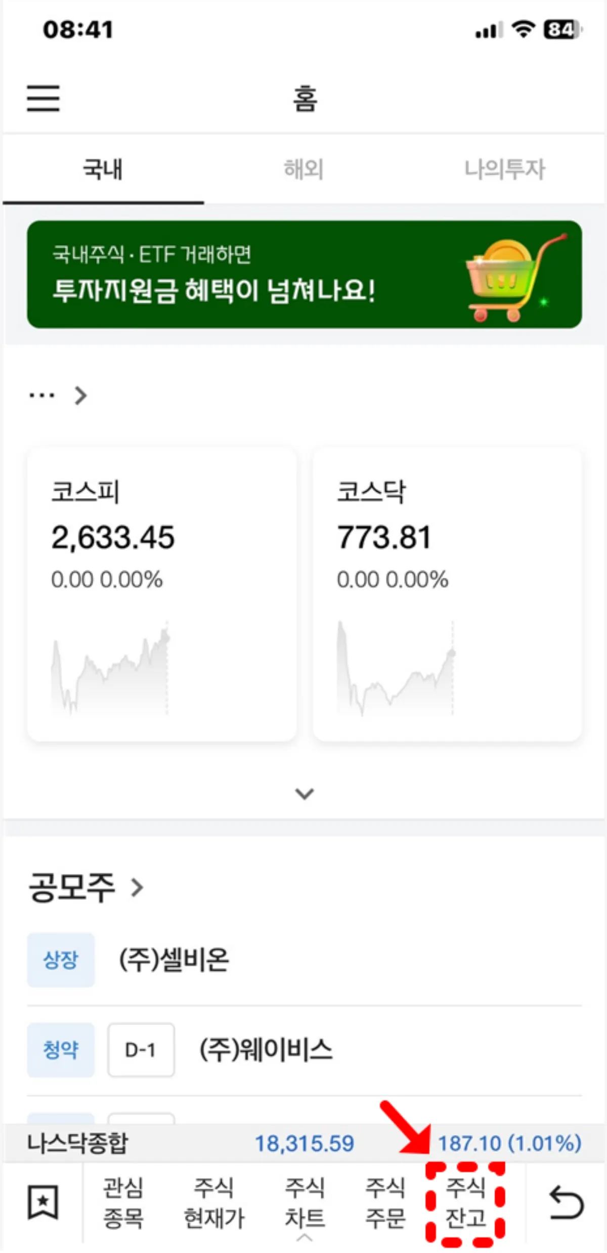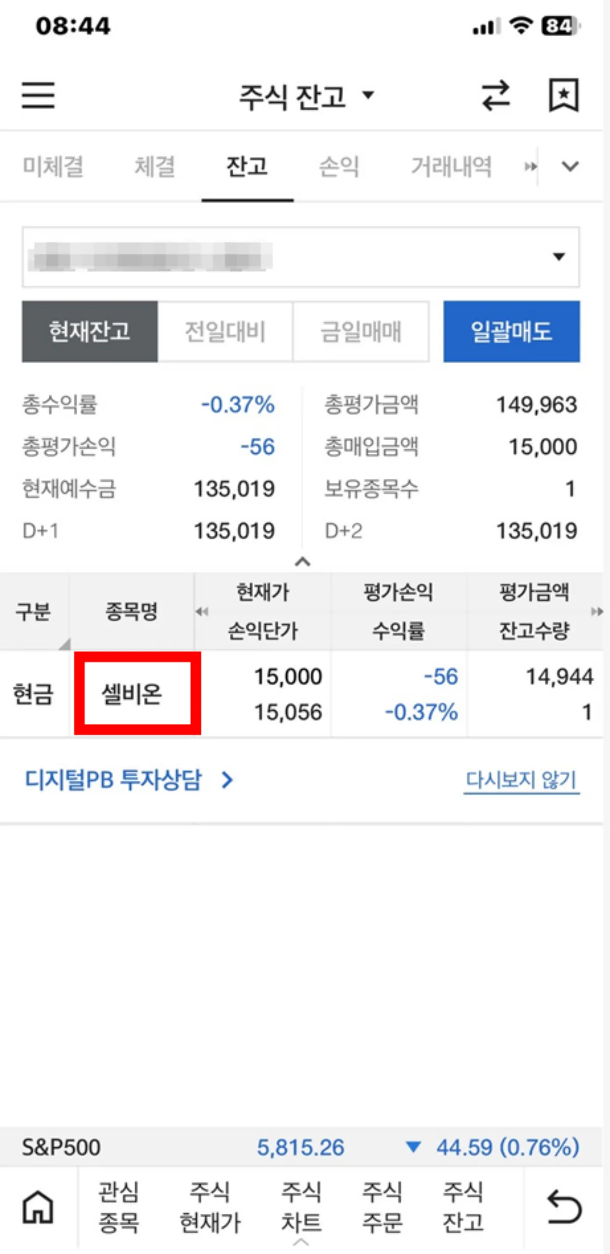 1. 시초가 매도는 상장일 오전 8:40 ~ 8:59 사이에 대신증권 어플에 접속해서 진행할 수 있습니다. 저는 1주를 배정받았는데요. 우측 하단에 '주식잔고'를 누르고 로그인합니다.