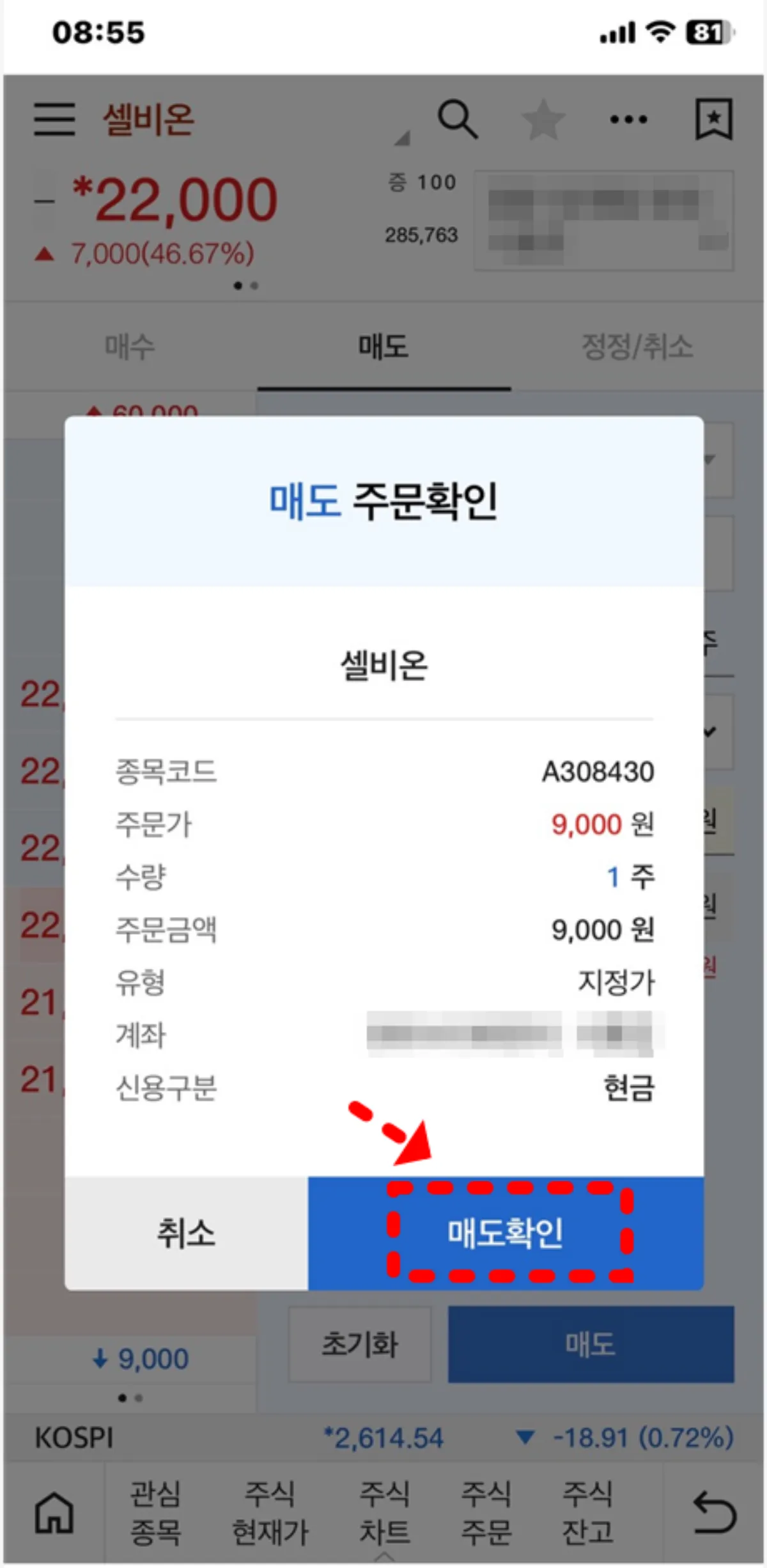 '매도 주문확인' 팝업창이 나오면 내용 확인 후 '매도확인'을 누릅니다.