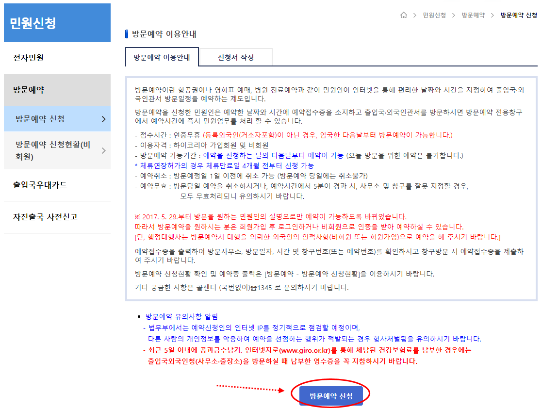 체류허가 신청 접수예약 또는