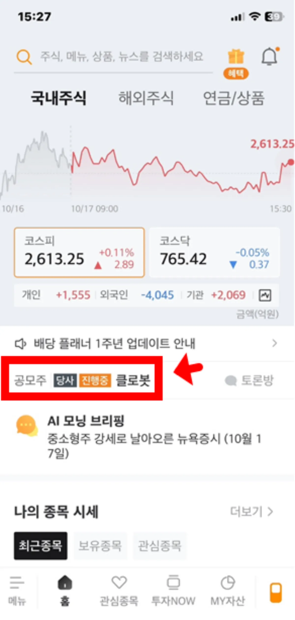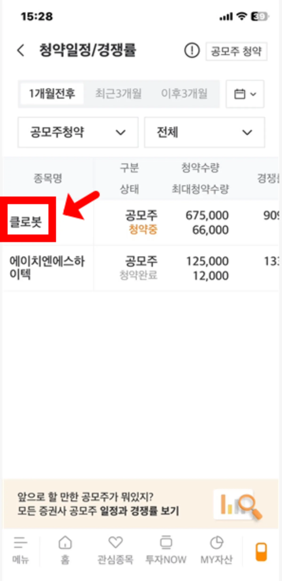 어플에 접속하면 진행 중인 공모주로 '클로봇'이 보이는데 누르고 로그인해 줍니다.