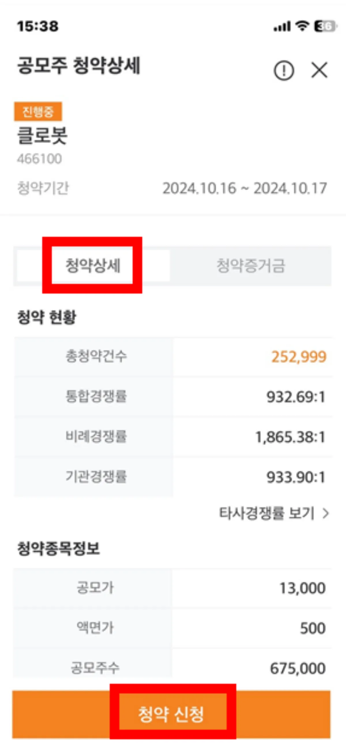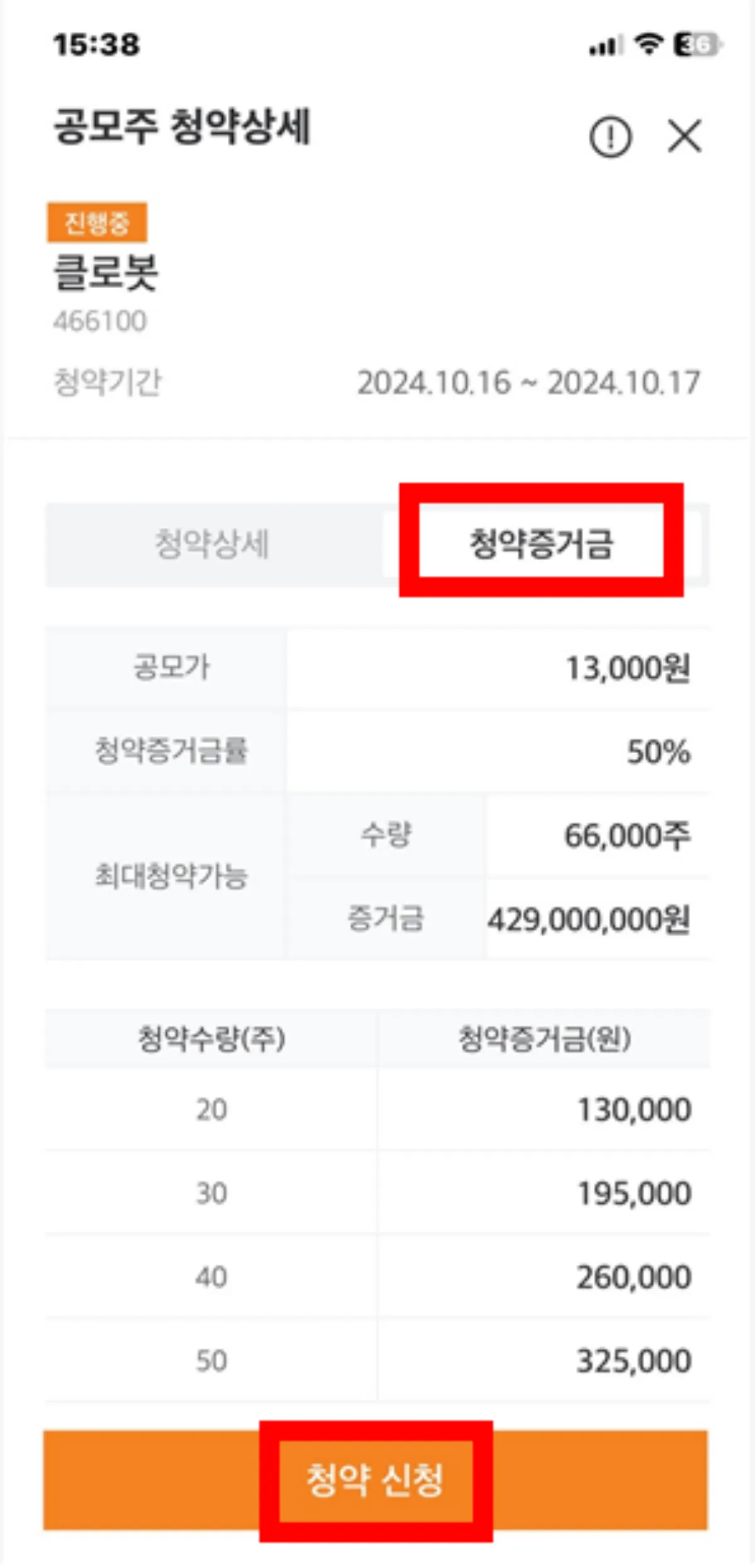 '공모주 청약상세' 화면에서 '청약상세'와 '청약증거금' 탭을 눌러 상세 내용을 확인할 수 있습니다.