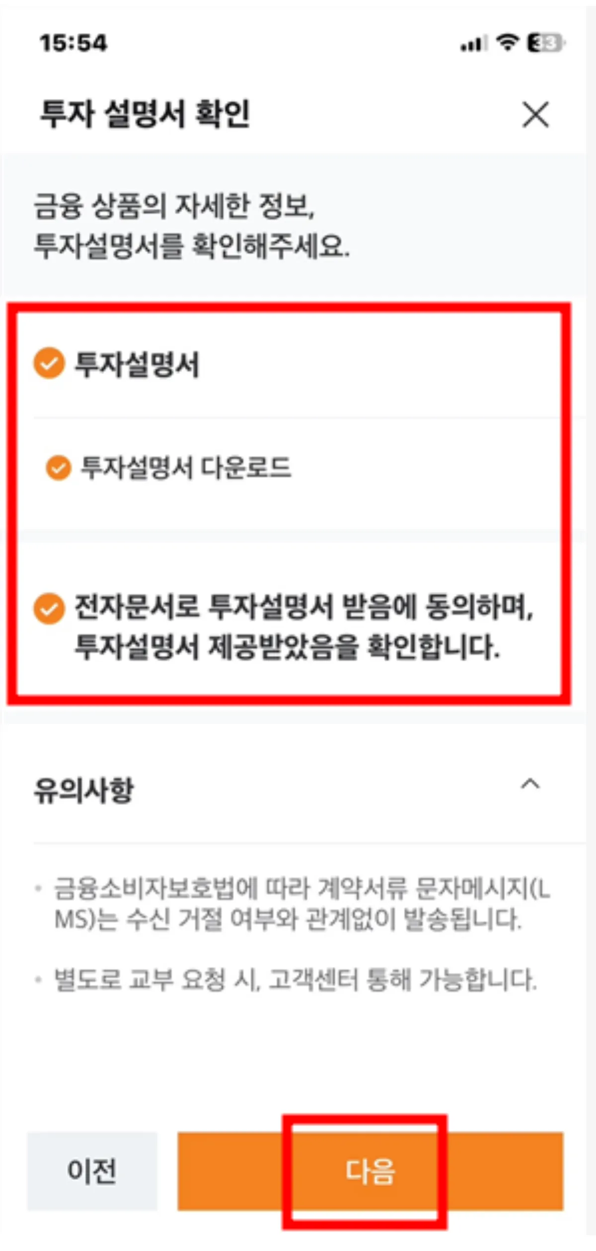 '환불금 입금, 입고계좌 신청 약관 동의' 체크 및 투자 설명서 확인 및 투자 상품에 대한 이해 확인에 대한 체크도 해주어야 하는데요.