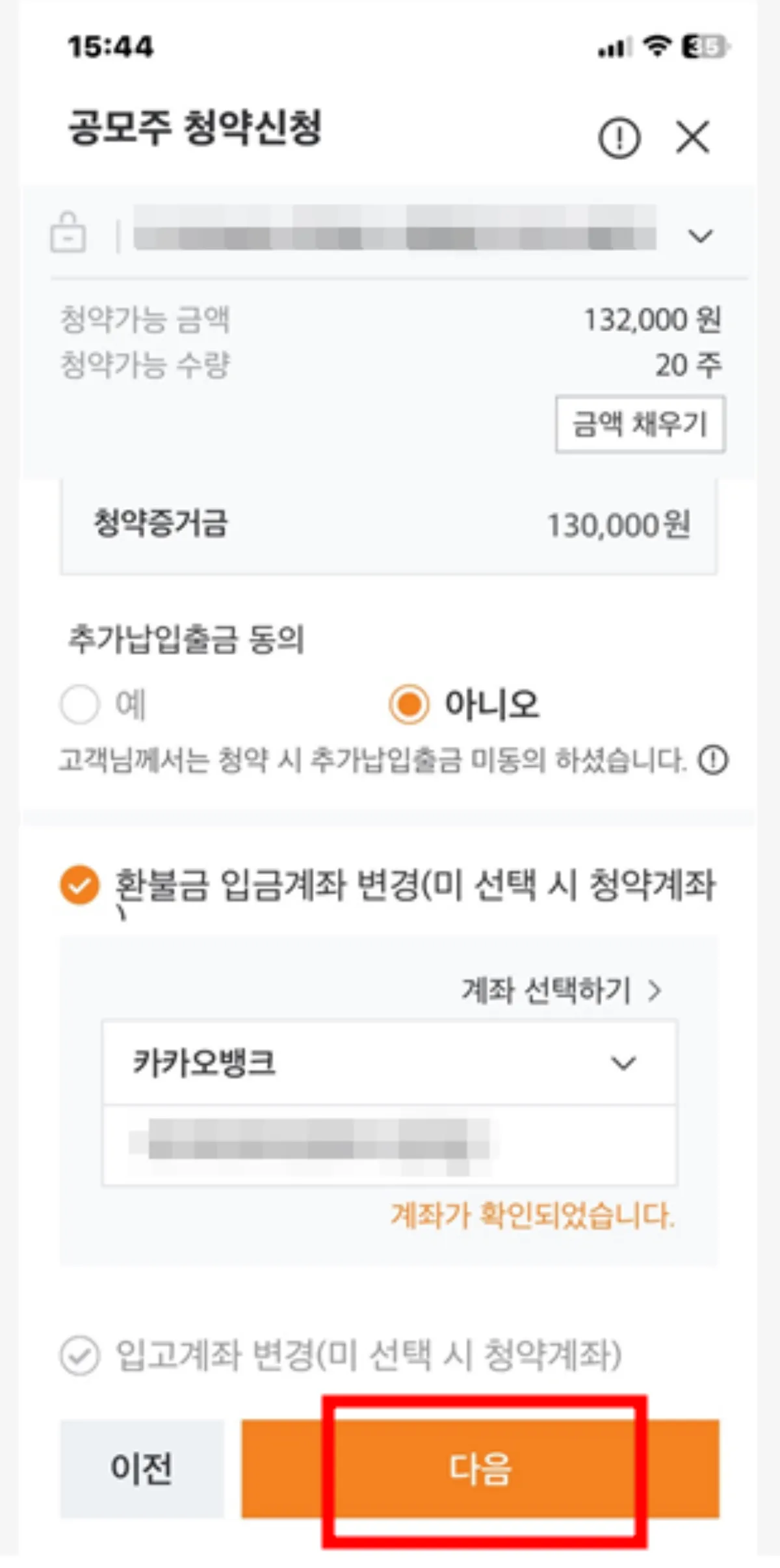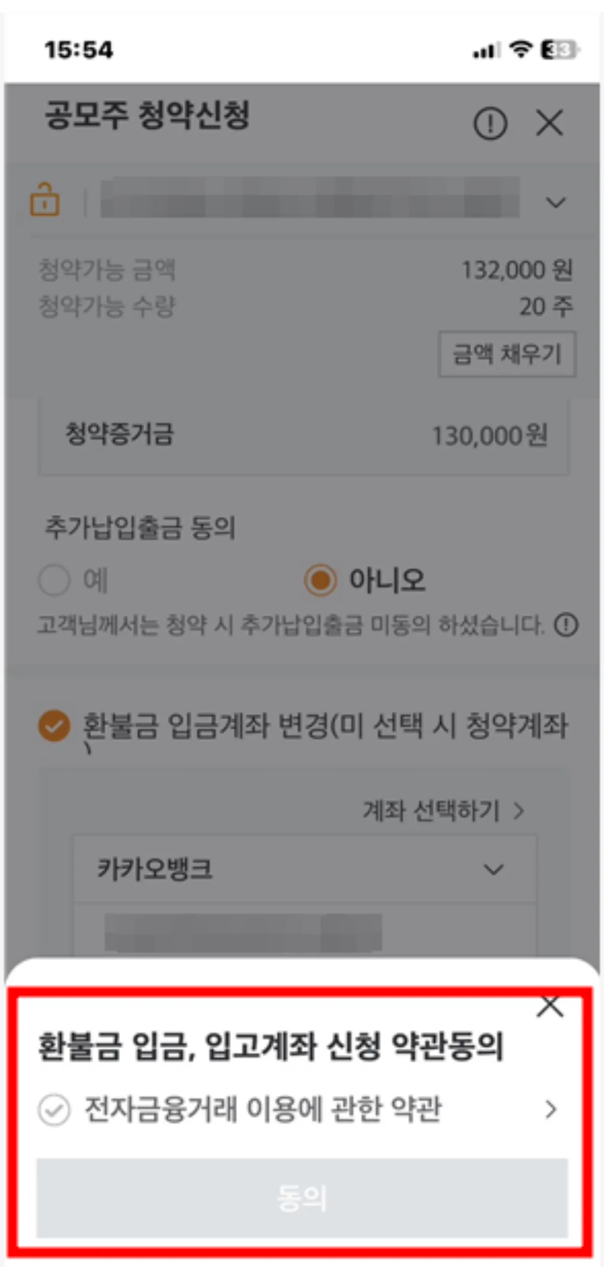 미래에셋증권 계좌에 증거금과 수수료를 미리 이체한 후 증권 어플을 열어줍니다. 저는 최소청약으로 진행해서 132,000원(20주)을 이체하였습니다.
