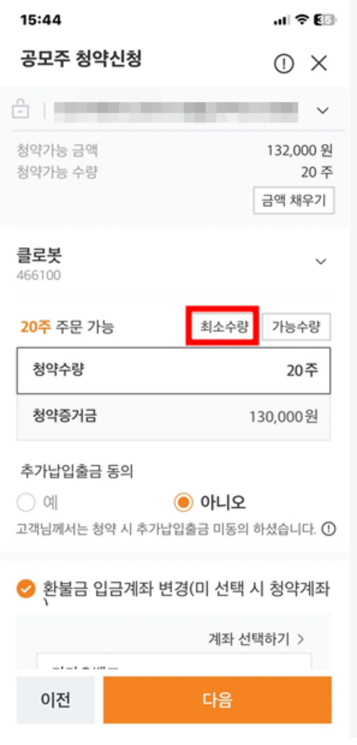 저처럼 '최소수량'으로 진행하실 분은 '최소수량'버튼을 눌러주시면 청약수량과 청약증거금 란에 반영이 됩니다.