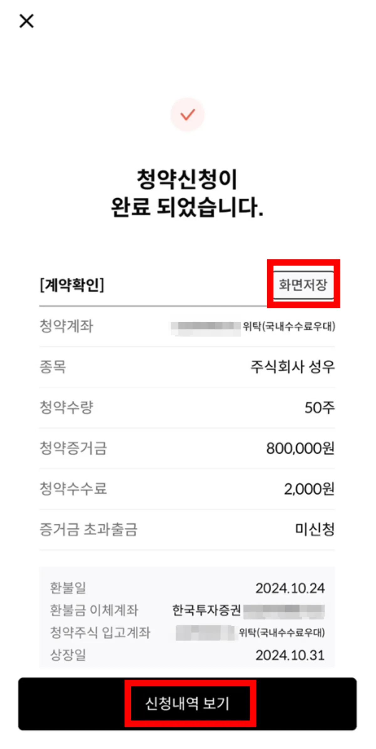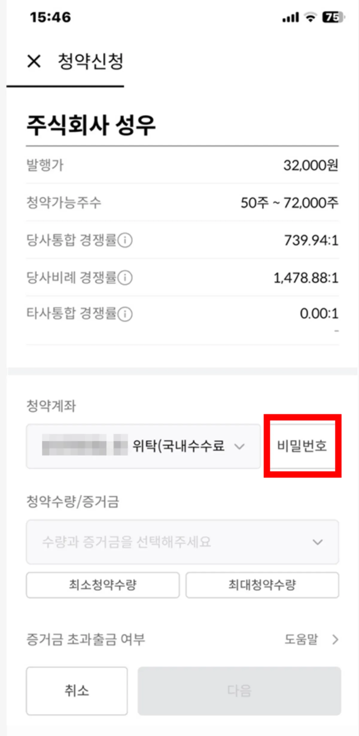 '환불금 이체계좌'와 '청약주식 입고계좌'를 설정해 줍니다.