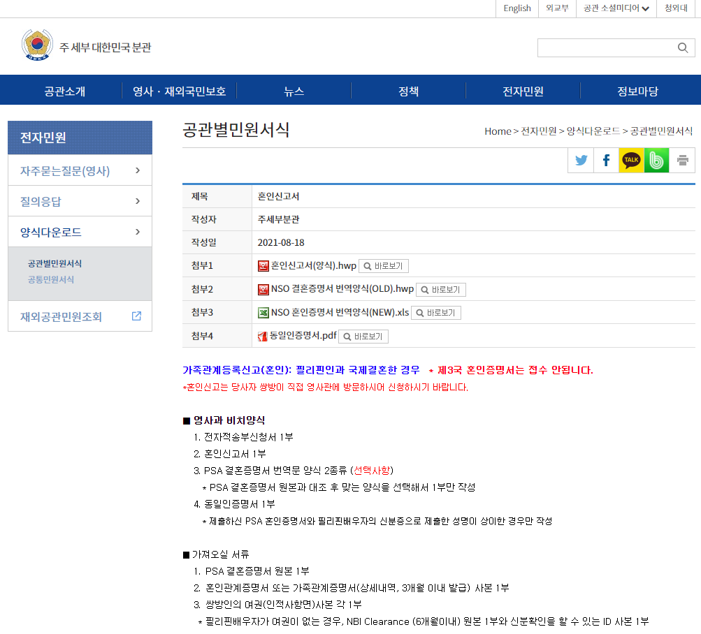 * 만일 외국인 배우자가 과거에 결혼한 적이 있다면, 본국에서 더 이상 혼인상태가 유효하지 않다는 것을 증명하는 서류가 필요하다고 합니다.