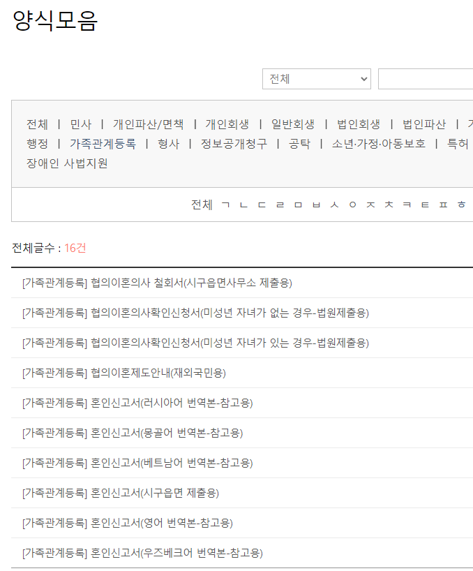 하지만 '대한민국법원 전자민원센터'에 들어가 보시면 영어, 중국어, 일본어, 태국어, 베트남어, 필리핀어, 우즈베크어, 캄보디아어, 러시아어, 몽골어 번역본도 참고용으로 있으므로 참고해 주시기 바랍니다.