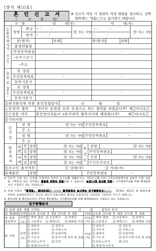 혼인신고서 양식은 한국어로 기재가 되어있습니다.