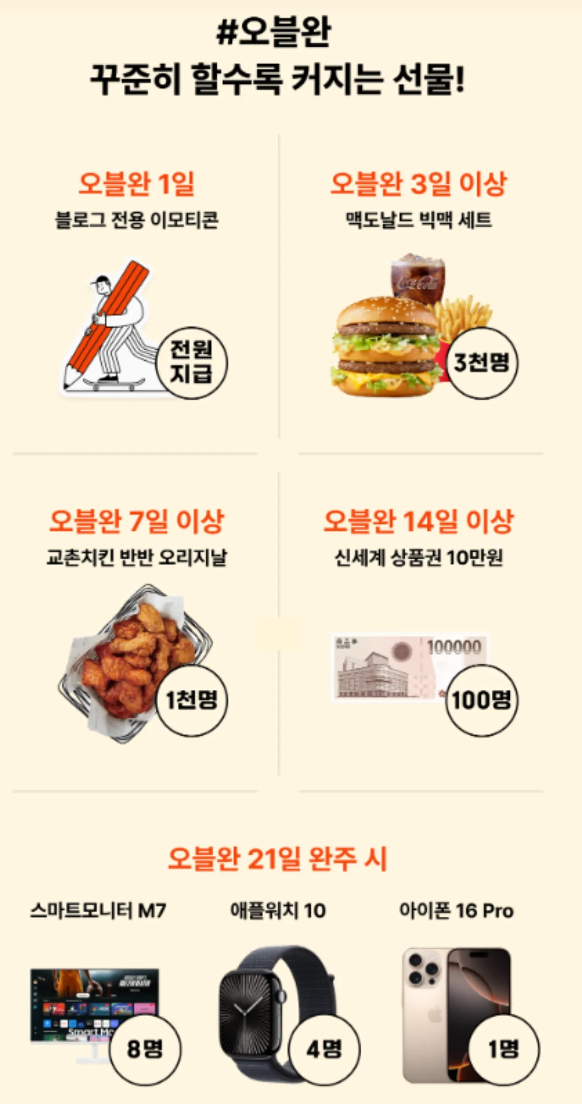 게다가 21일 포스팅 완주 시 선물은 '스마트모니터 M7', '애플워치 10', '아이폰 16 Pro'라고 해요. 저도 핸드폰 바꿀 때가 되긴 했는데.. 아이폰 16 진짜 갖고 싶네요 ㅎㅎ