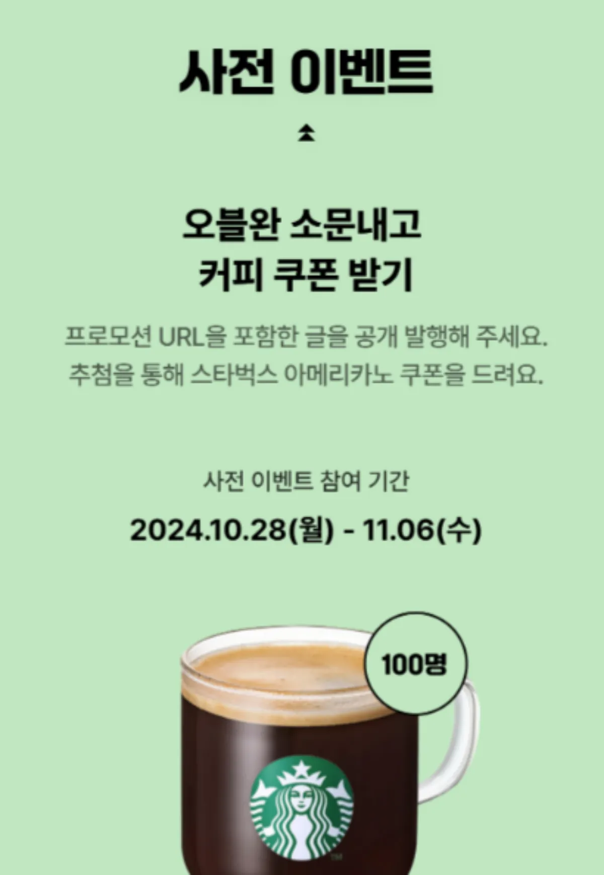 사전 이벤트도 있는데요. 오블완 프로모션 url을 포함한 글을 공개 발행하면 추첨을 통해 스타벅스 아메리카노 쿠폰을 준다고 해요. 당첨자 발표는 11월 둘째 주 예정이고 당첨자는 '티스토리 알림'을 통해 개별 안내 예정이라고 합니다.
