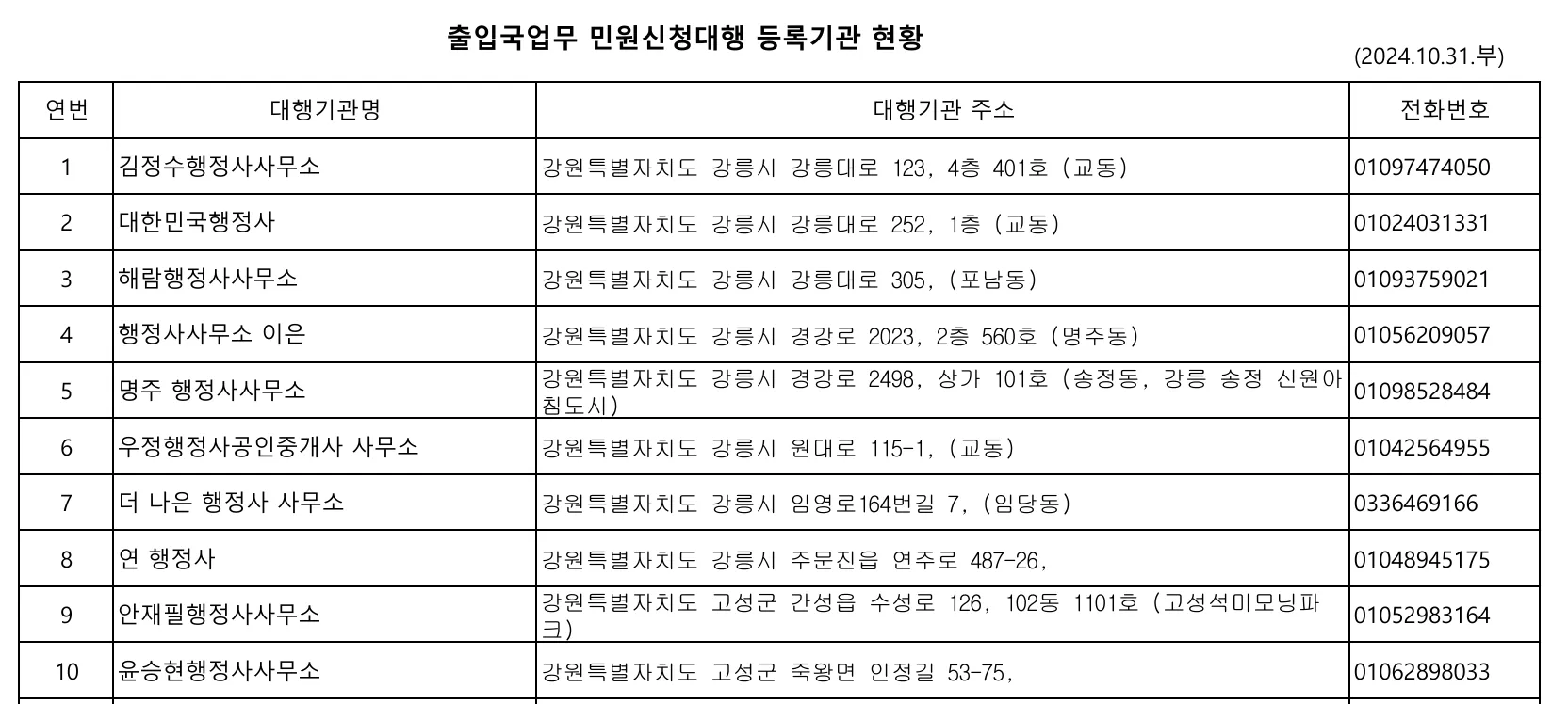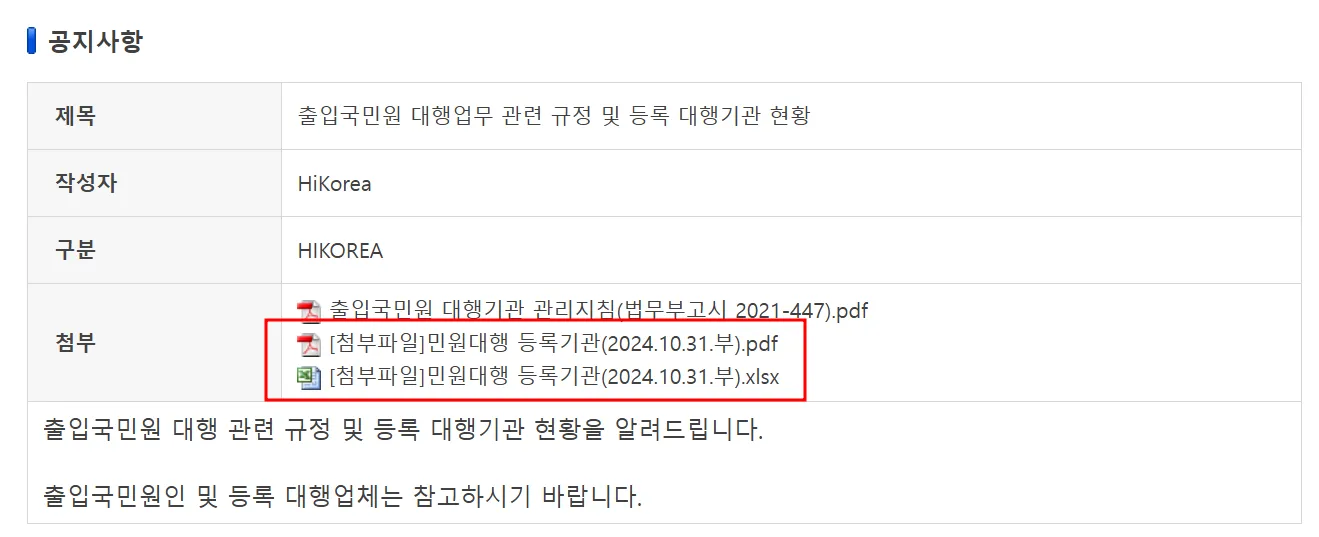2024.10.31일 자로 업데이트된 민원대행등록기관이 pdf와 엑셀 파일로 첨부되어 있으니 편한 파일로 클릭하여 확인하시면 됩니다.
