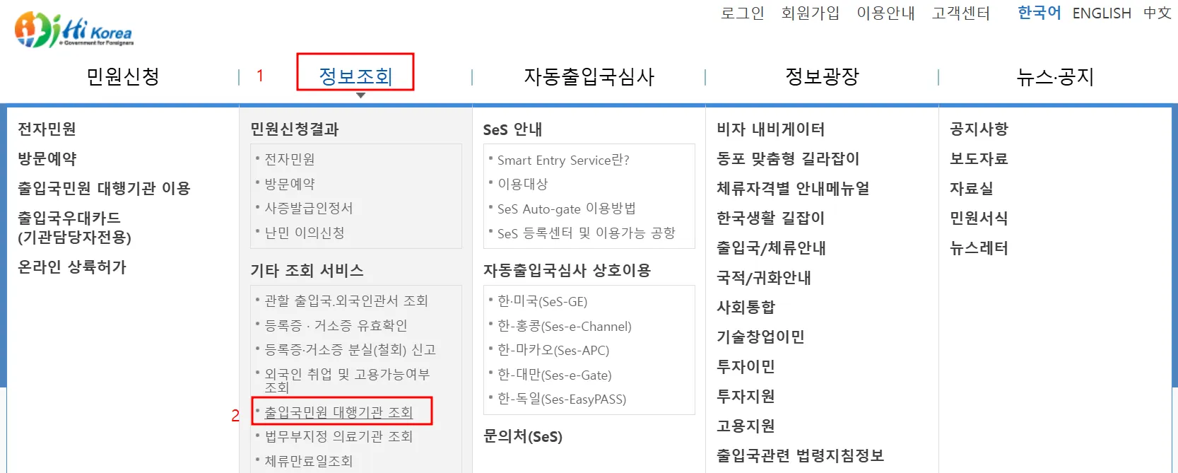 하이코리아 사이트에 접속해서 상단 '정보조회'에 마우스를 대고 아래 나오는 '출입국민원 대행기관 조회'를 누릅니다.