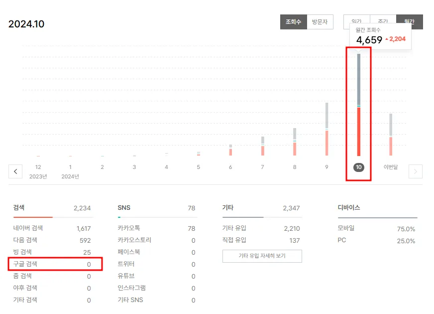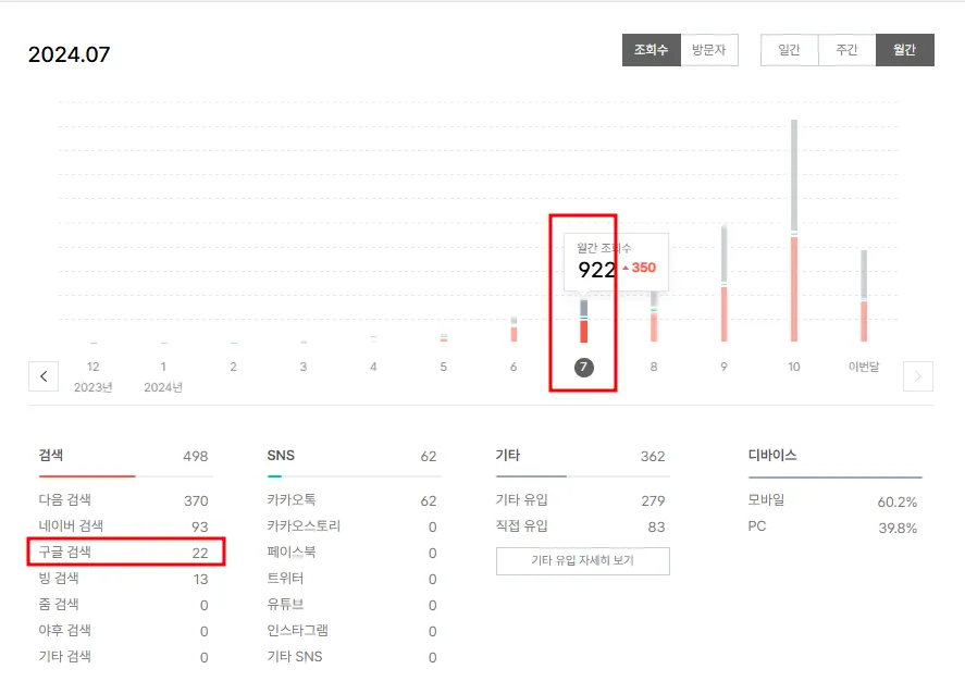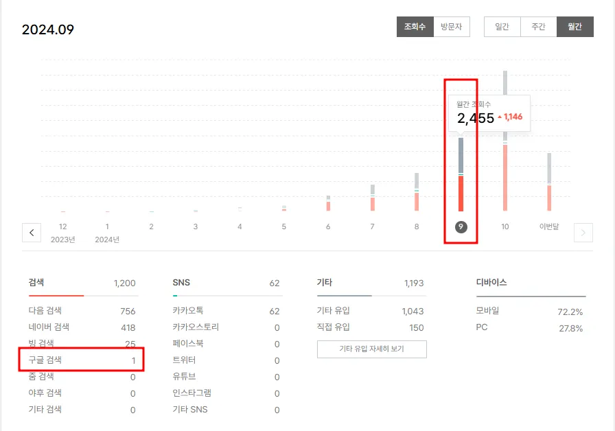 7월이 구글 검색 유입이 그나마 제일 많았던 22였고 8월부터 반토막으로 줄어들더니 9월은 1 그리고 10월~11월은 0입니다.