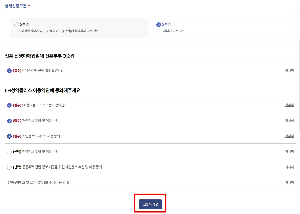 본인에게 해당되는 항목을 선택하고 이용약관 동의에 체크 후 맨 밑에 '신청서 작성'을 클릭합니다.