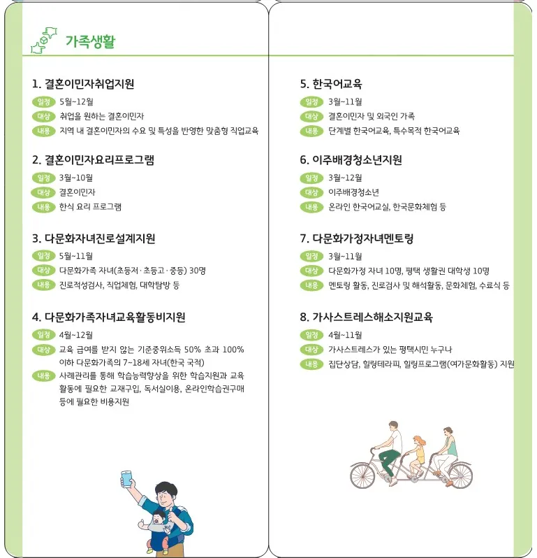 그 밖에도 취업을 원하는 결혼이민자를 위한 맞춤형 직업교육, 결혼이민자 요리프로그램, 다문화 가족 자녀 교육 활동비 지원, 결혼이민자 및 외국인 가족 한국어 교육 등의 프로그램도 진행하네요.