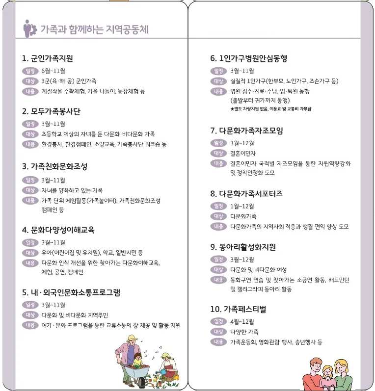 또 3군(육·해 · 공) 군인가족을 대상으로 계절작물 수확체험, 가을 나들이, 농장 체험등 지원 프로그램 제공, 한부모가족, 노인가구, 조손가구 등 실질적 1인가구를 위한 병원 안심 동행 등의 프로그램도 있고요.