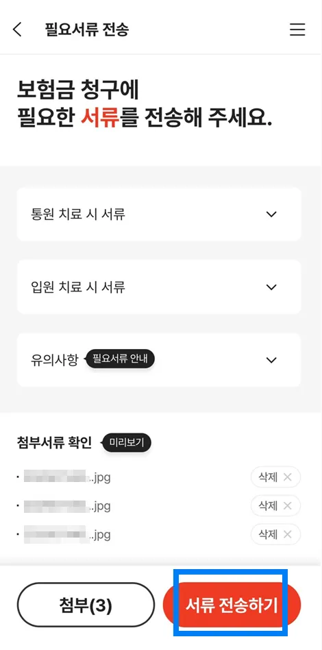 | 통원 치료시 서류 | [공통] - 진료비 계산 영수증(일자별 병원 및 약국 영수증, 처방전) - 진료비 세부내역서(비급여 진료비 없는 경우 생략 가능) [추가서류] 청구금액 3만원 이상 10만원 이하 시 - 진료비 계산 영수증(일자별 병원 및 약국 영수증, 처방전) 청구금액 10만원 초과 시 - 진단명(질병분류코드) 및 통원일(기간)이 포함된 서류 예) 진단서, 통원확인서, 처방전 등 |