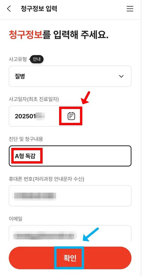 '진단 및 청구내용'에 'A형 독감'을 입력하고 맨 아래 '확인' 버튼을 누릅니다.
