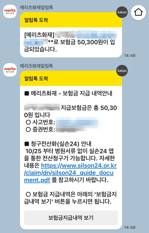 평일 화요일에 신청했었는데 이틀뒤인 목요일에 보험금 입금이 되었네요.