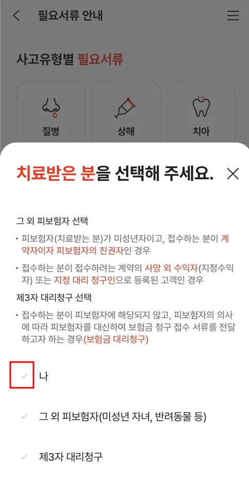 '치료받은 분'을 선택합니다. 저는 '나'에 체크해 주었습니다.